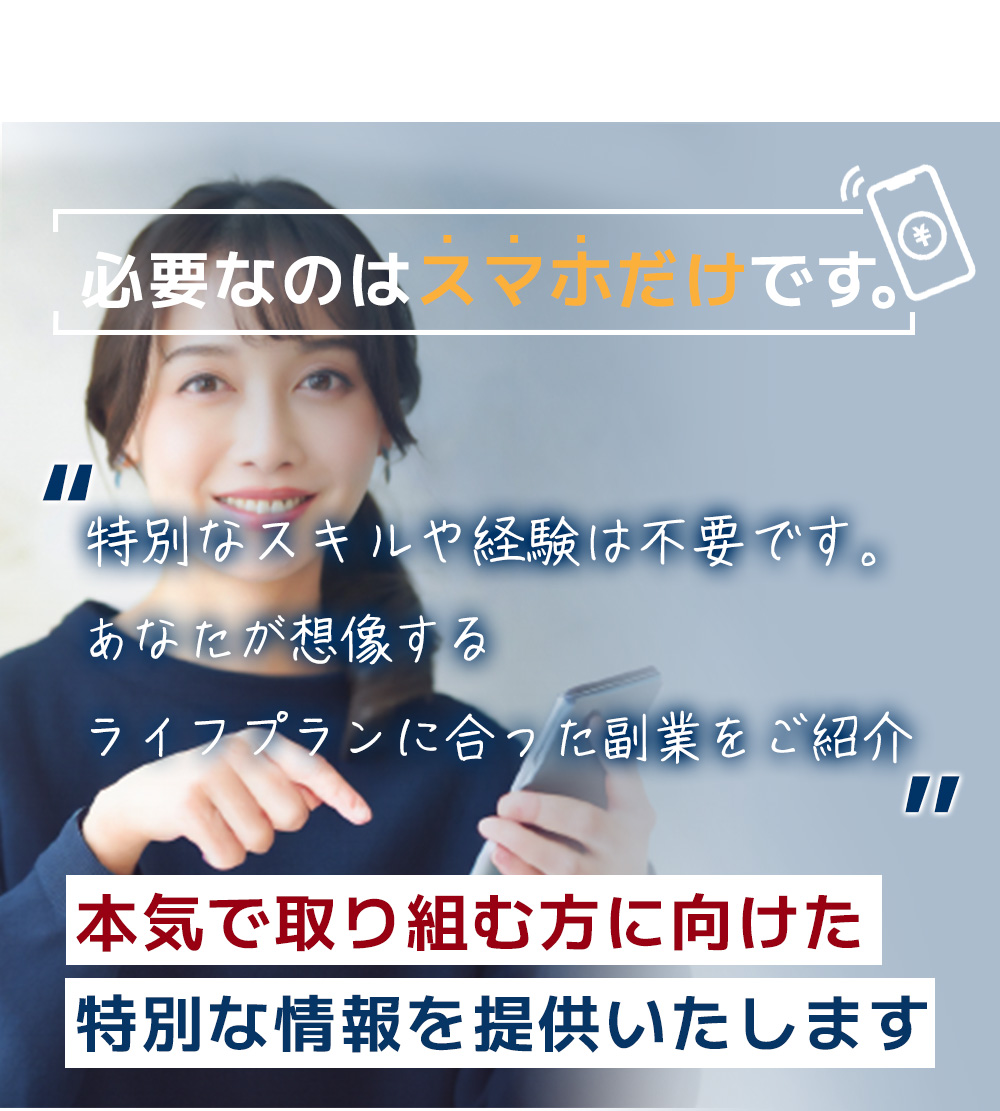 A. 基本的に発生いたしません。 ただし、ご紹介する副業サービスにおいて副業に関する必要なコンテンツ等で費用が発生する場合もございます。 費用としては3,000円〜でございます。